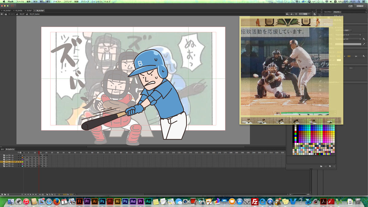 当時の作業キャプチャ。ピッチングやバッティングシーンは実写を参考にしていました。今ならiPadに資料を映しながら作業すると思います。キャラクターのパーツ分けは少ないと思います。いわゆるFlashアニメのモーションの動きを感じさせたくなかったので、パーツを変形させるより描いて枚数増やしていきました。